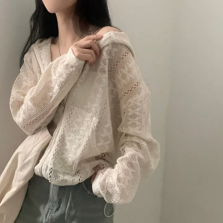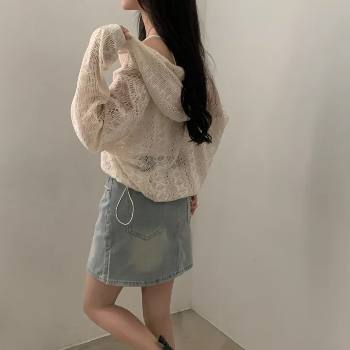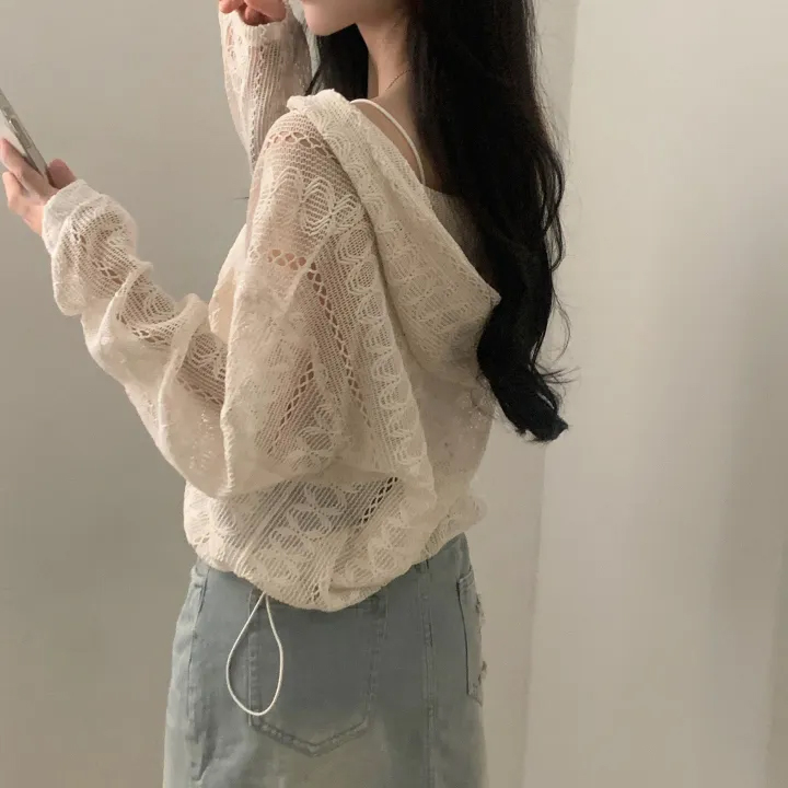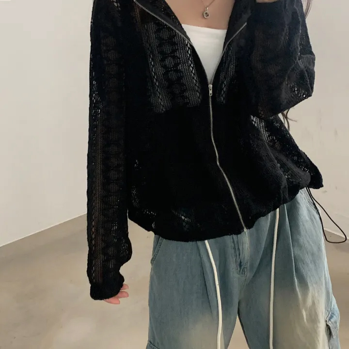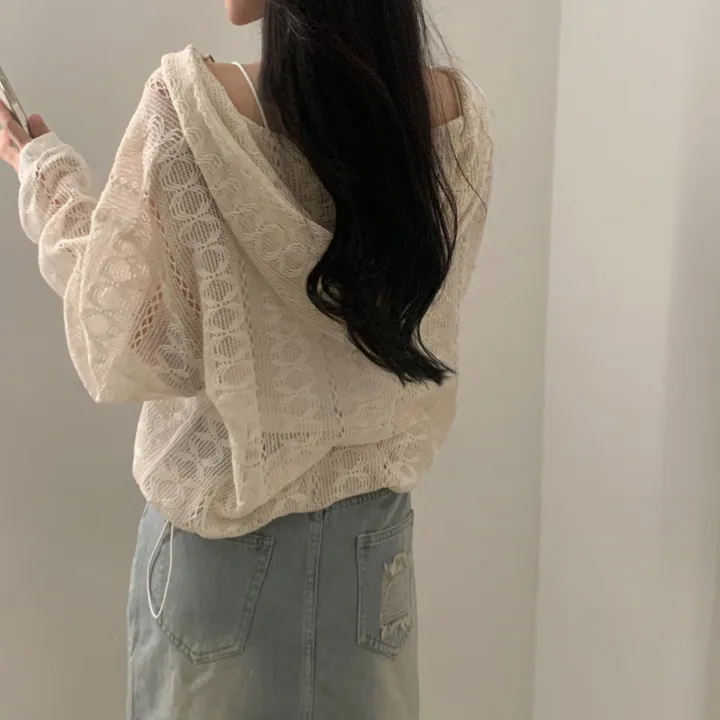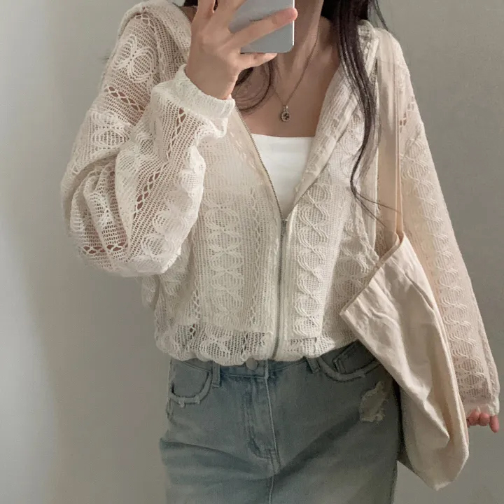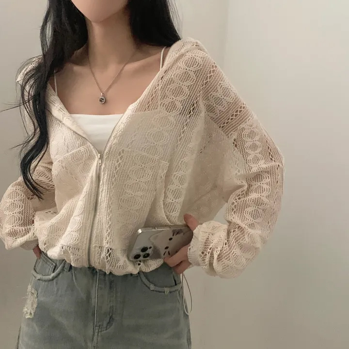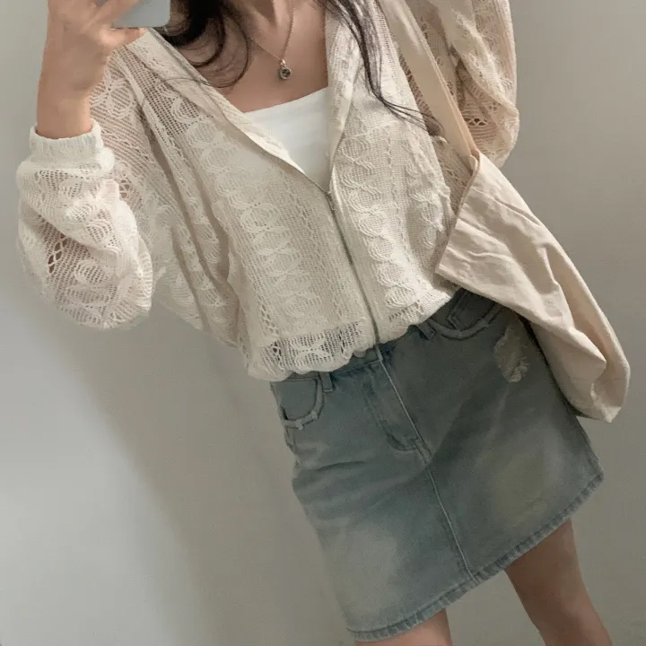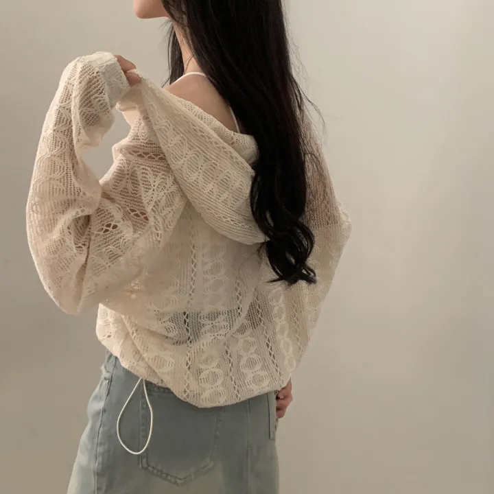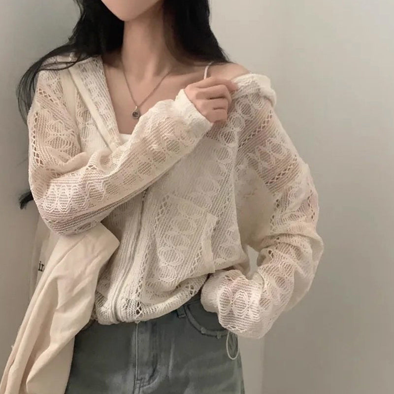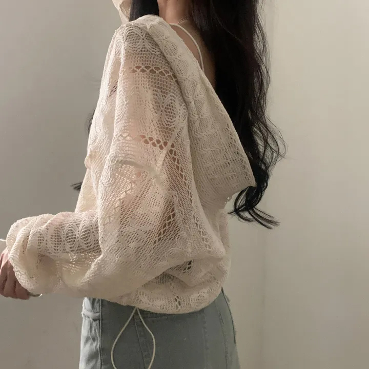 Hollow Jacquard Drawstring Hem Long Sleeve Hooded Lace Coat