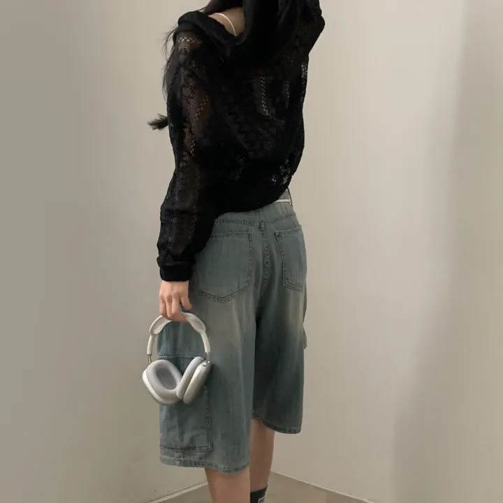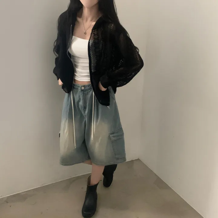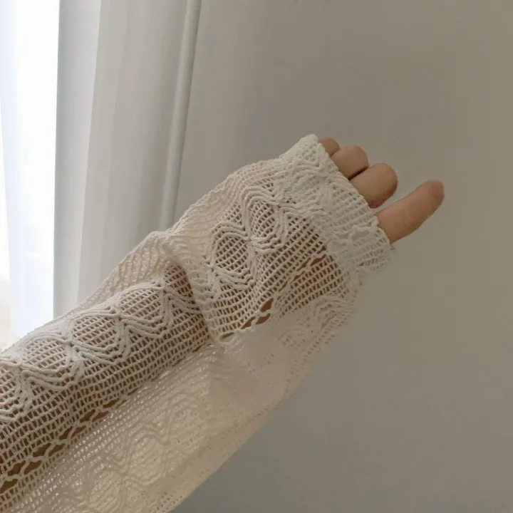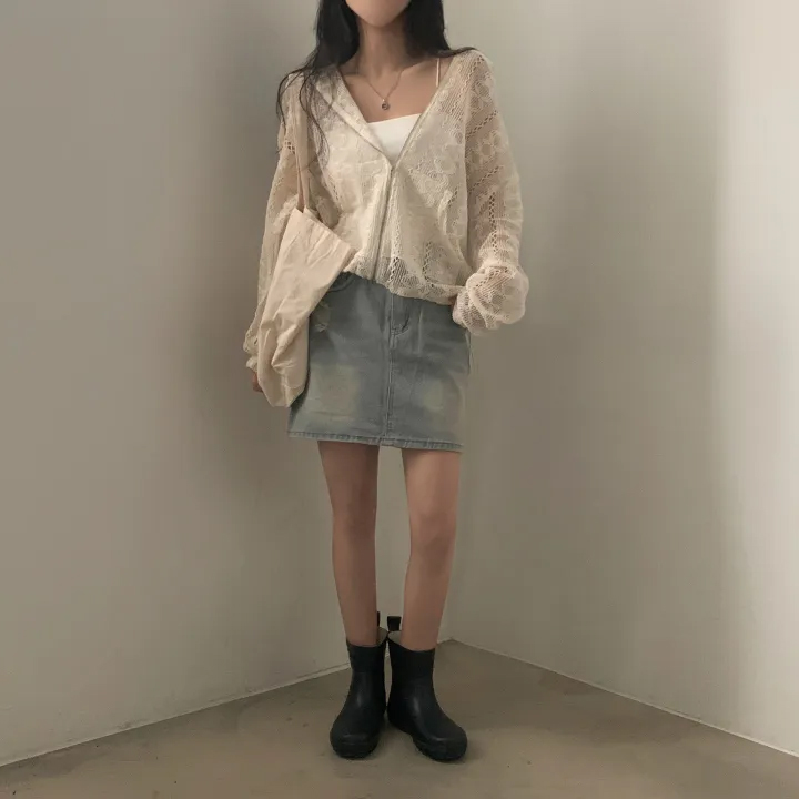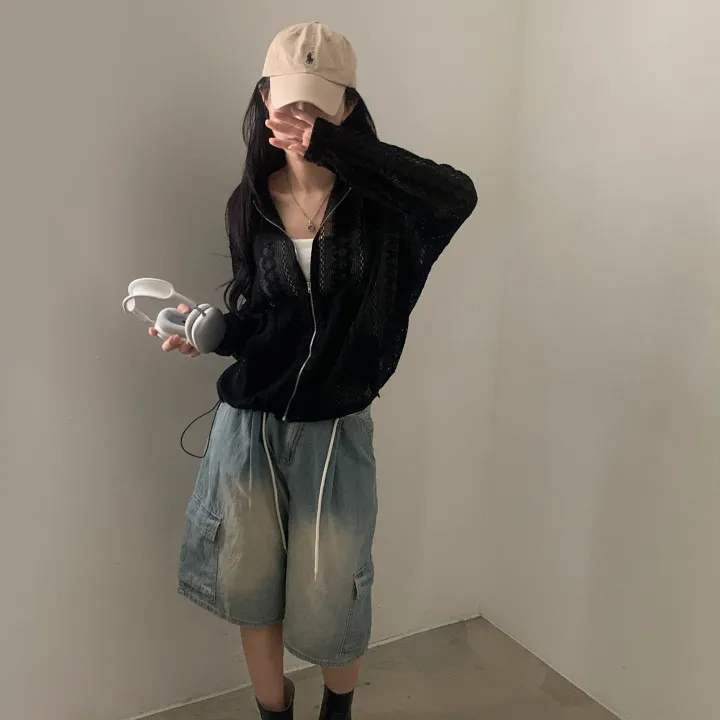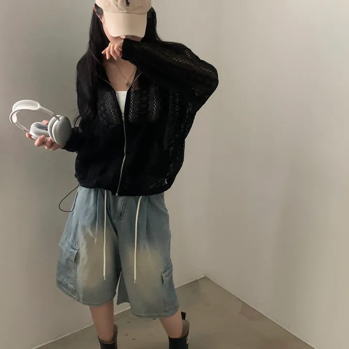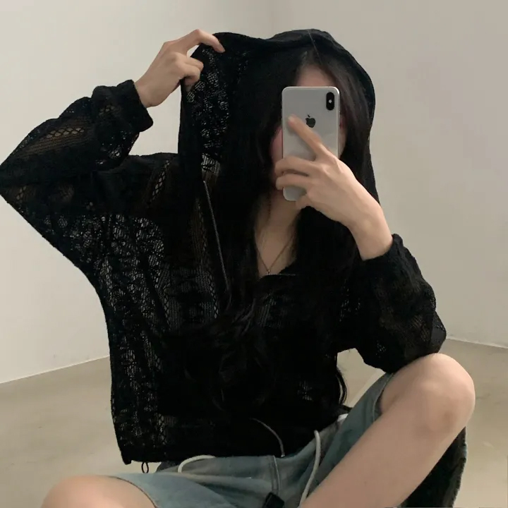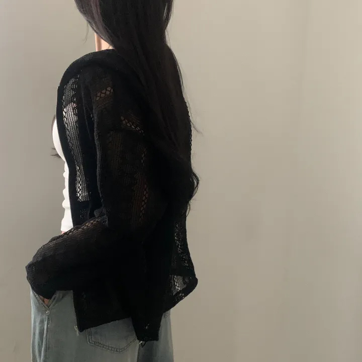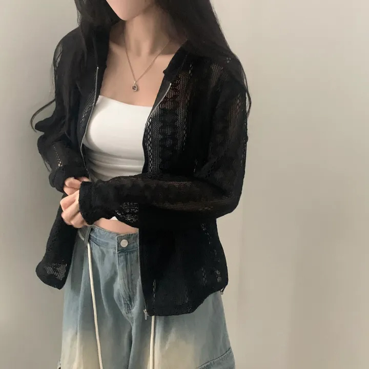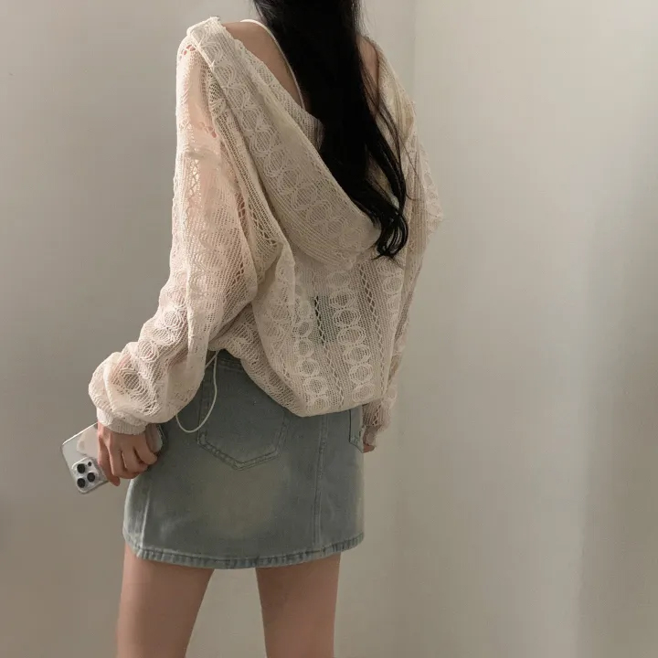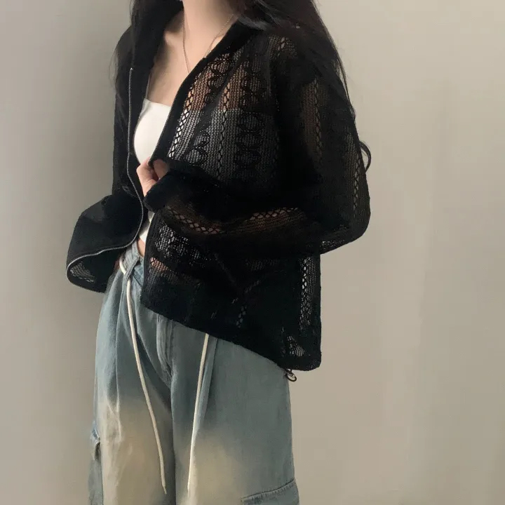 Hollow Jacquard Drawstring Hem Long Sleeve Hooded Lace Coat