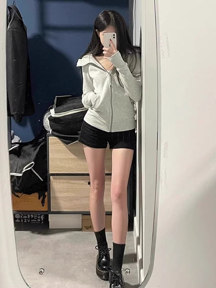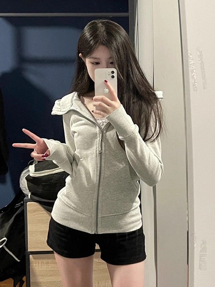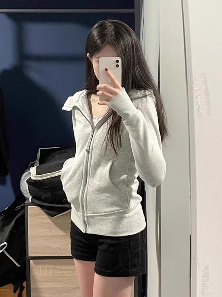 With Finger Buckle Hooded Slim Fit Waist Trimming Coat Zipper Cardigan Sweater